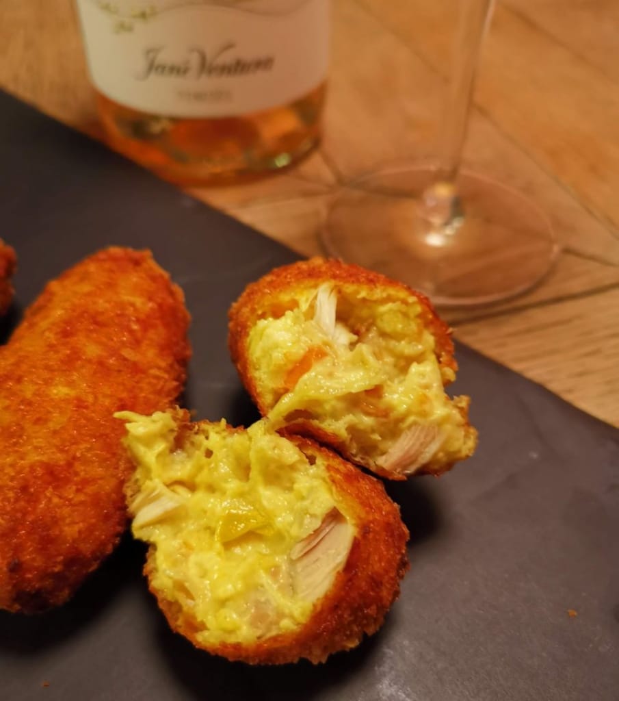 Unas croquetas de abundancia tanto en su gramaje como en trozos de jamón en su relleno. Personalmente, nunca me había encontrado tal tamaño de virutas de jamón en una croqueta. Además, puedes disfrutar de tanta majestuosidad maridando con un vino tinto de la tierra. ¡Locura croquetil!